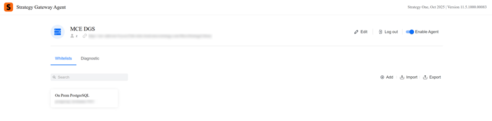 After the Gateway Agent is enabled, users can create a new data source using the Gateway Agent or starting in Strategy One (November 2025), clusters. Use this data source to connect to on-premises data sources specified in the whitelist from the Strategy Cloud Environment.