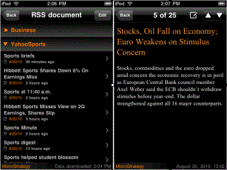 You can add an RSS Reader widget to a document, then display the widget when the document is viewed on a mobile device, as shown in the image above. Users can select an RSS feed to display a list of news items, then select an item to display from the list.