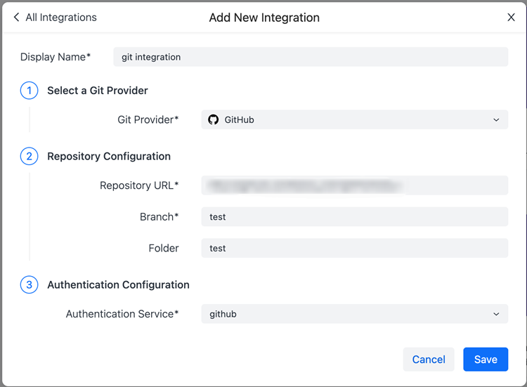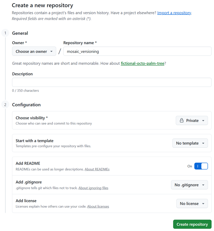 • Repository URL: Enter the GitHub repository URL (for example, https://github.com/<github_account>/mosaic_versioning).