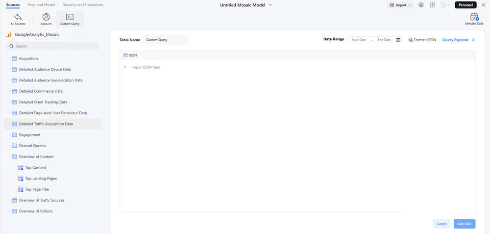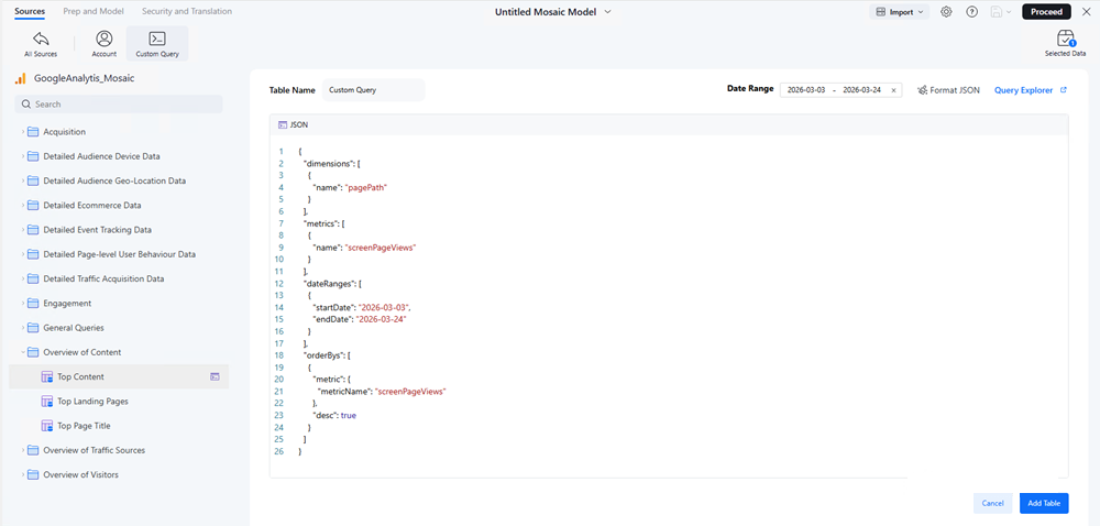 Choose a Date Range and click Add Table from Query.