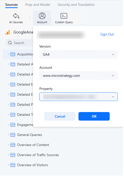 Expand the Version, Account, and Property drop-down lists and specify your Google Analytics account details.