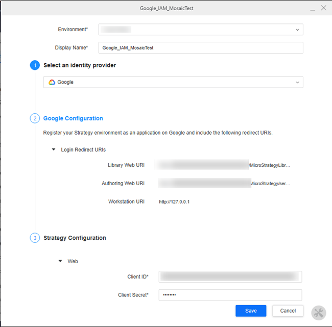 In Strategy Configuration, enter the Client ID and Client Secret you copied in Create an OAuth Application in Google.