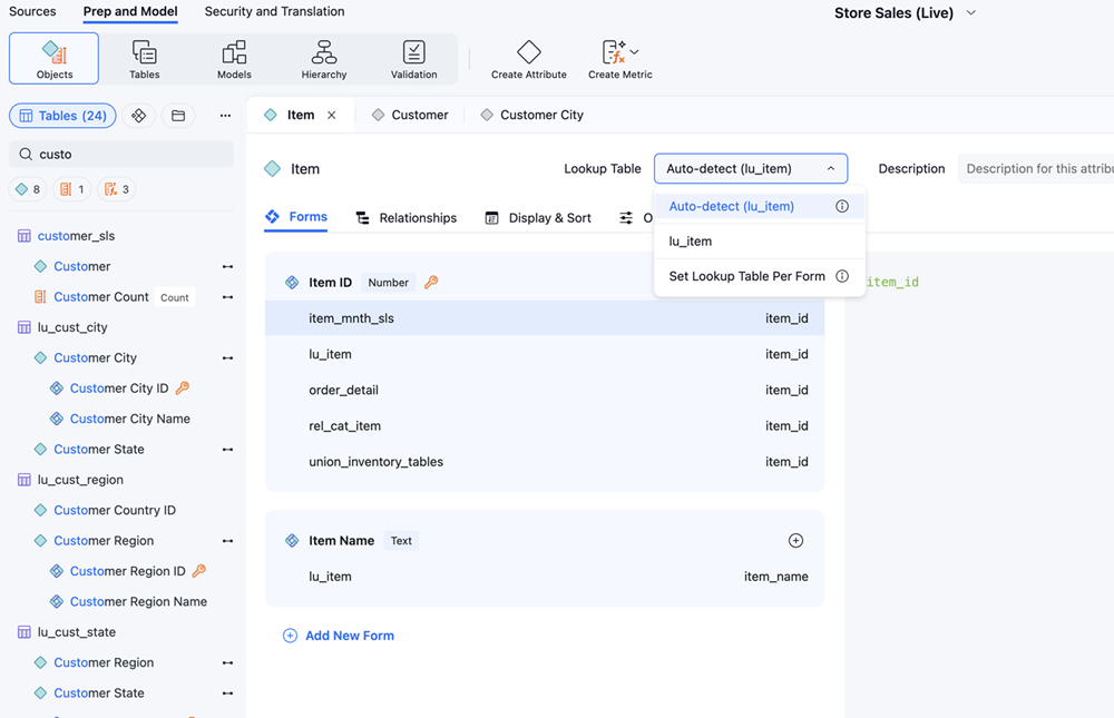 Store ID, appears in multiple tables, for exampleSales_FactandStore_Dimension, it should display in these tables in the Table View. Similarly, the attribute editor displays that the key form lists all tables where the attribute is mapped to. -