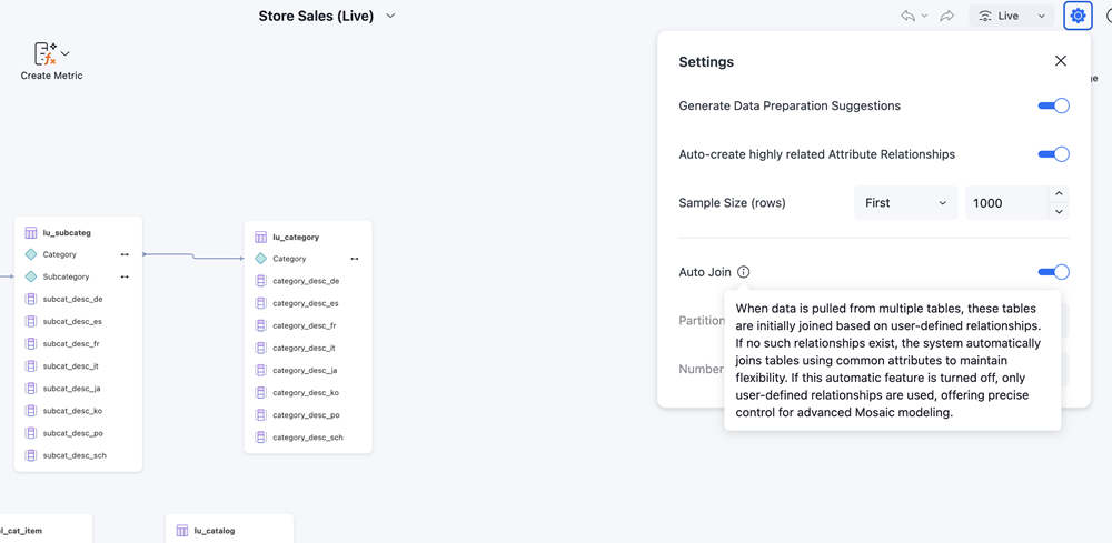 Mosaic models can work without defined relations. The system will use an Auto-join behavior, which is enabled by default. When the data is pulled from multiple tables, the tables are initially joined based on user-defined relationships or automatically generated relationship tables. If the relationships do not exist, the system automatically joins tables using common attributes to maintain flexibility.