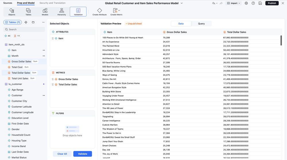 Starting in Strategy One (March 2026), you can validate your Mosaic models while creating or editing your models without having to a build a dashboard or complete the full deployment process. Quickly preview data and the underlying query to ensure your model behaves as expected.