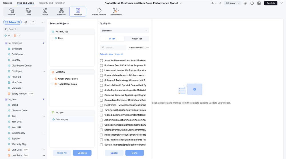 In the Prep and Model page, click Validation.