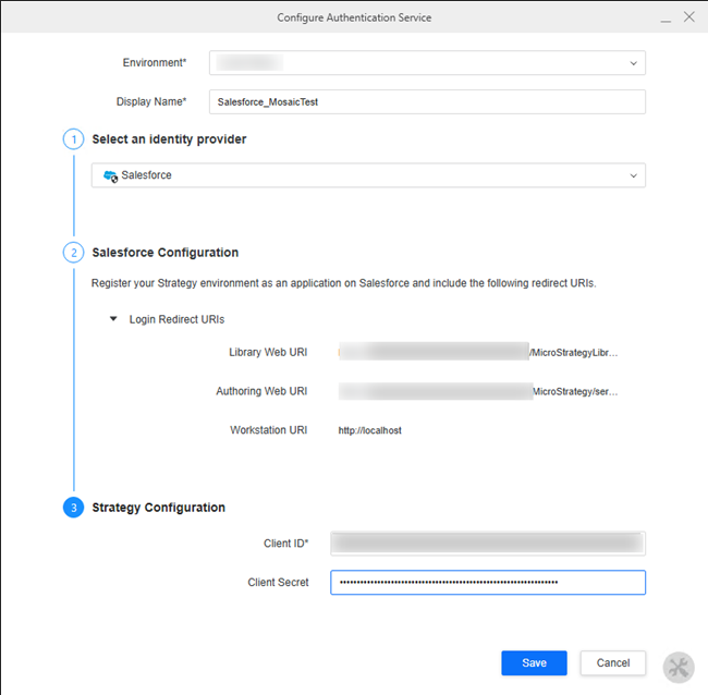 In Strategy Configuration, enter the Client ID and Client Secret you copied in Create an OAuth Application in Salesforce.