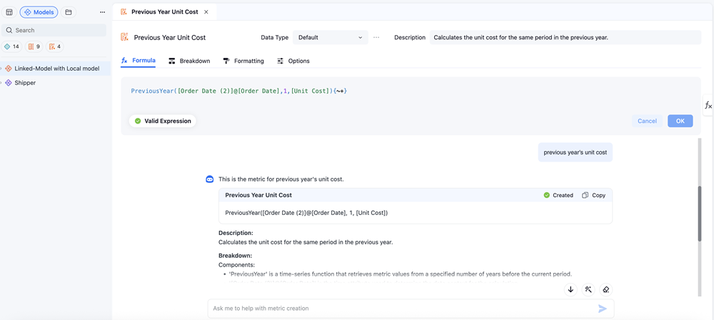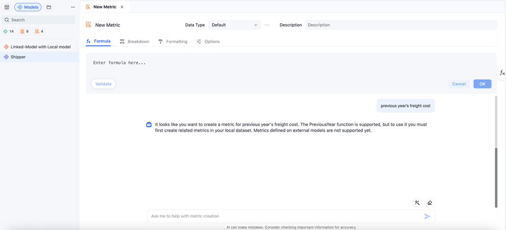 Users can use Auto Metric to create a previous period function within a linked model against a local model, but not an external model.