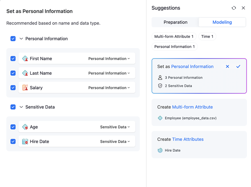 Choose Personal Information for objects such as names and salary or choose Sensitive Data for objects your business deems sensitive such as age and hire date.