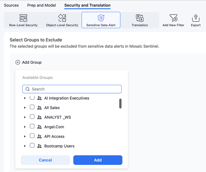 For example, if you do not want members of the HR group to trigger alerts whenever they access salary data, the Mosaic model owner can add the HR group to Sensitive Data Alert, as shown below. With this configuration, normal and expected access patterns will no longer generate alerts, only anomalous behavior will.