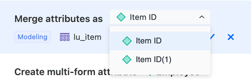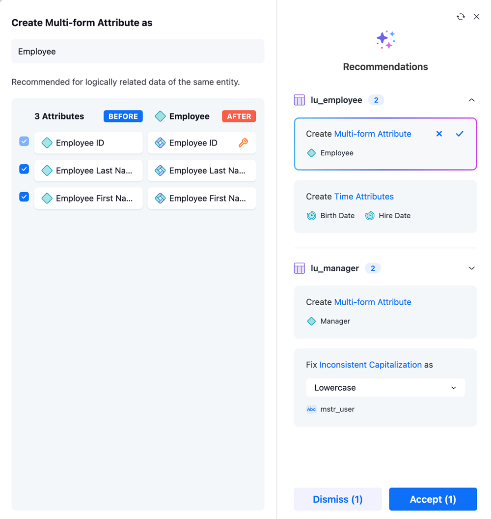 複数フォームのアトリビュートを作成する AI の候補のうち、2 フォームのアトリビュートは自動的に適用され、3 つ以上のフォームを含む候補は推奨設定パネルです。