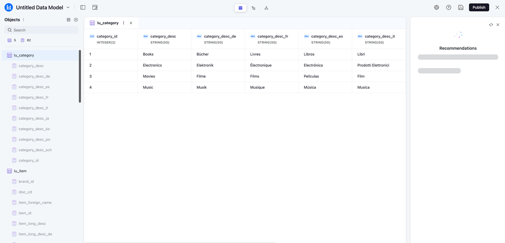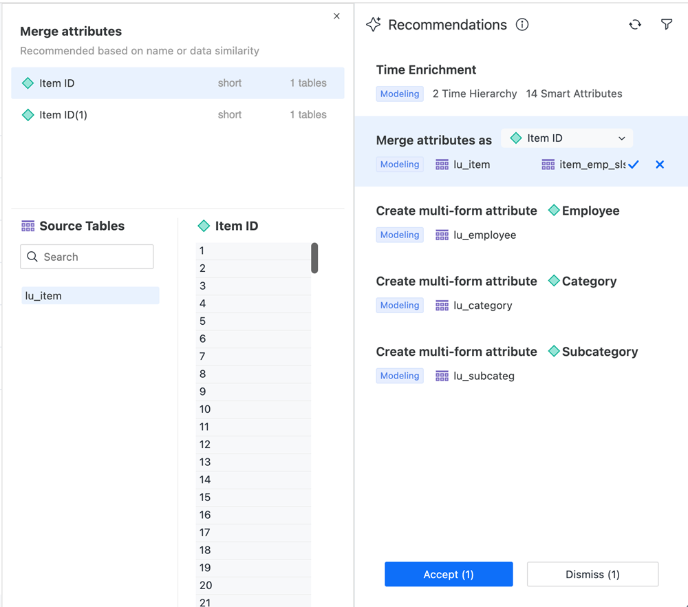 すべてのアトリビュートは、テキスト、数値、日付のグループに分類され、AI を使用してアトリビュート リンクを提示します。互換性のあるデータ型の推奨アトリビュート リンク フィルター。そのため、推奨事項パネルに表示されるアトリビュート リンクの推奨事項は適用可能でなければなりません。