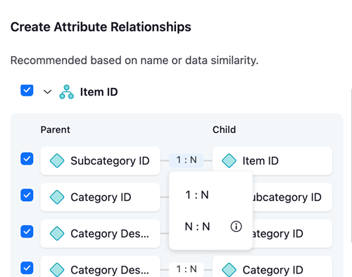 自動モデルは、アトリビュート名のセマンティックに基づいてアトリビュートの 1 対 1 のリレーションシップおよび 1 対多のリレーションシップを検出し、サンプル データとのリレーションシップを検証します。