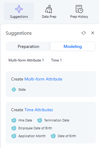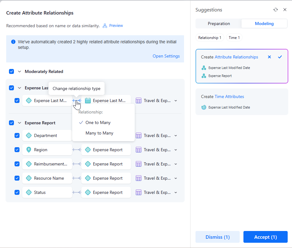 すべての属性は、テキスト、数値、日付グループに分類され、AIを使用して属性リンクを提案します。推奨される属性リンクは、互換性のあるデータ型でフィルタリングされます。したがって、提案パネルに表示される属性リンクの提案は、適用するのに有効である必要があります。