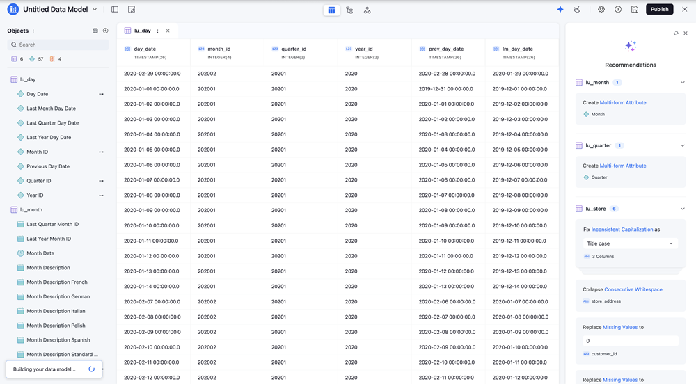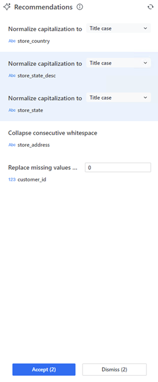 新しいテーブルがデータ モデルに追加されると、推奨事項が自動的に生成されます。サンプル データに基づいて、データ推奨事項が右パネルに表示され、承認または解除できます。