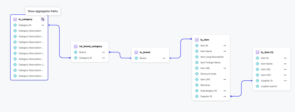 テーブル内の属性の集計パスを表示するには、テーブル名にカーソルを合わせて、Show Aggregation Paths をクリックします。