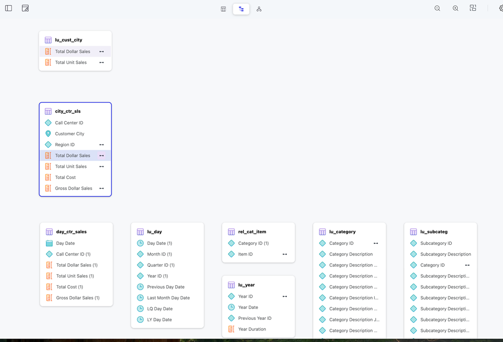 テーブル マッピング ビューは、テーブル間での明確かつ効率的な属性とメトリックのマッピングを容易にします。インタラクティブな図を使用して関係を表示し、ドラッグアンドドロップのマッピング機能とリアルタイム検証を備え、テーブルが Mosaicモデル とどのように接続して相互作用するかを定義および可視化するのに役立ちます。
