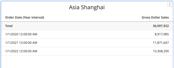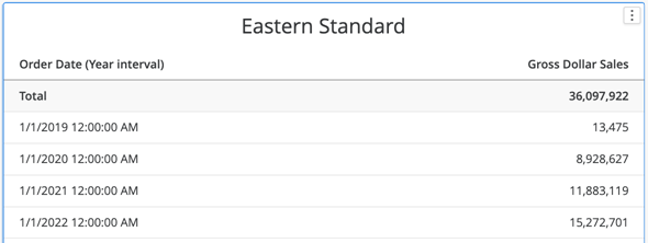 以下のタイムベースのレポート例では、東部標準時とアジアの上海タイムゾーンの年間注文データの結果を並べて表示します。東部標準グリッドのみが 2019 データを表示します。どちらのグリッドにも、すべての年の売上が含まれています。というのも、総計は で一致しているからです。 36,097,922。