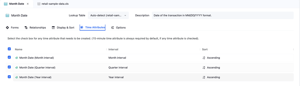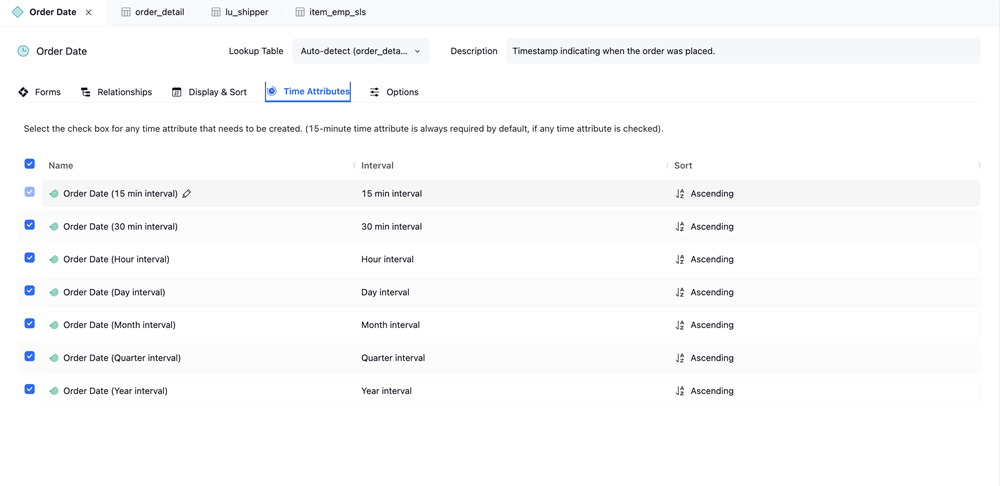 TimeStampまたはDateTimeデータ型:Order Date上記の例では、日目、時間、 30 分、、および15 分間隔。選択: 15 分スマート アトリビュートを作成する場合、間隔は必須です。
