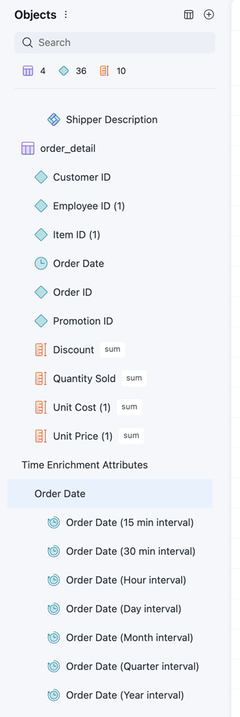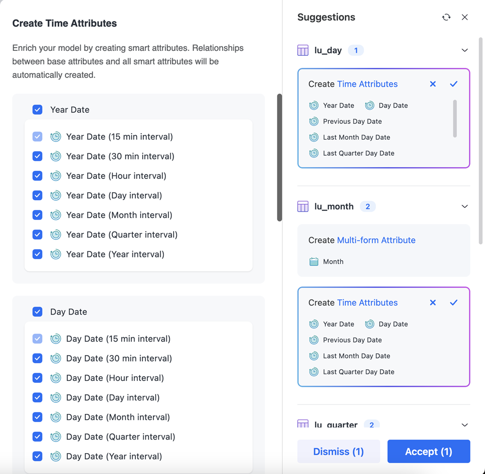 自動モデルを使用し、スマート アトリビュートを使用してタイム ディメンションを作成できます。スマート アトリビュートには固定の時間間隔が含まれます。これにより、ディメンションごとに個別のアトリビュートを作成しなくても完全な時間階層を簡単に作成できます。自動モデルでは、データ モデル内に堅牢かつ柔軟な時間ディメンションを自動的に構築できるため、時間分析機能が大幅に強化されます。