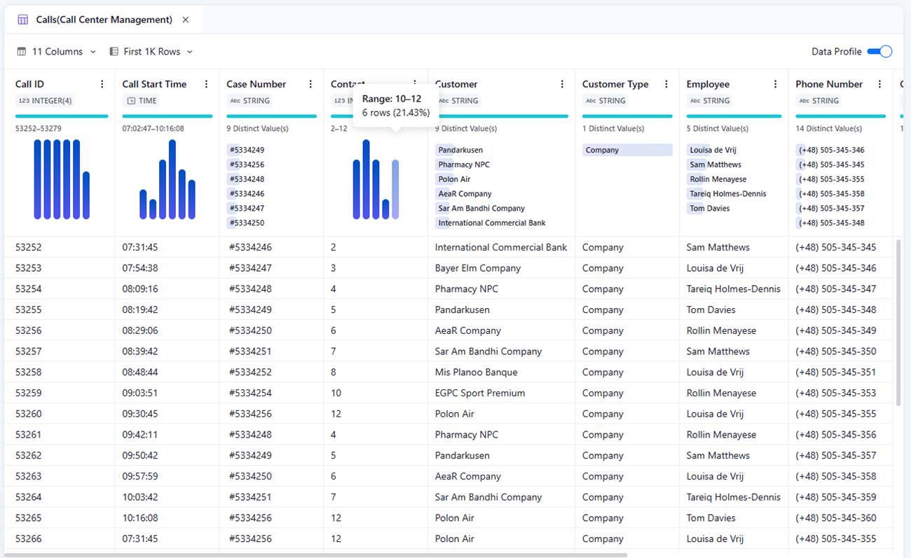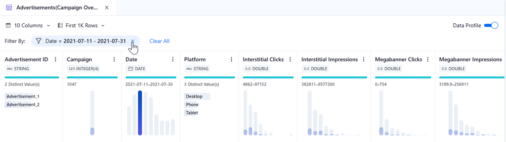 各列名の下に値のリストとヒストグラムで構成されるData Profileを表示します。