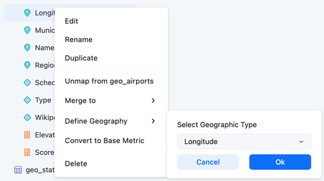 Mosaic modelでデータをインポートする際、CountryやCityなどの一部の列は、Geographical roleとして定義できます。このロールは、ダッシュボードで緯度と経度のデータを推測し、マップビジュアライゼーションの作成を支援します。Geographical roleは、自動的に検出されるか、手動で定義できます。