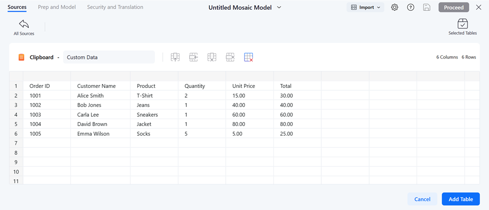 コピーアンドペーストまたは Mosaicモデルに直接入力してデータをインポートできます。