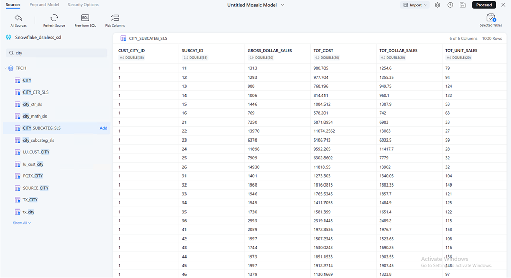 6. Mosaicモデルに含めるまたは除外する列を編集するには、列ヘッダーの横にある表示トグルをクリックするか、列を選択をクリックして表示したい列の横にあるチェックボックスを選択します。