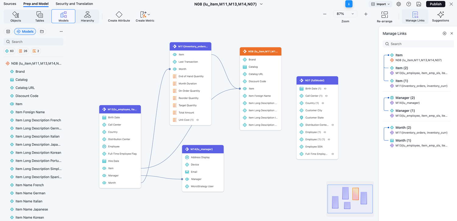 Strategy One (2025 年 12 月) 以降、モデルを作成および編集するときに、Mosaicモデル 間で属性をリンクできます。モデル ビューを使用すると、使用可能なすべてのモデルを表形式で表示し、リンクされた属性を通じてそれらの相互関係を表示できます。