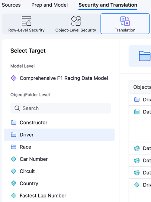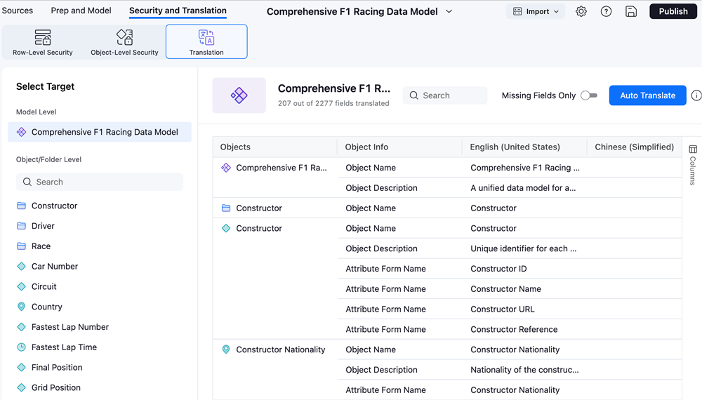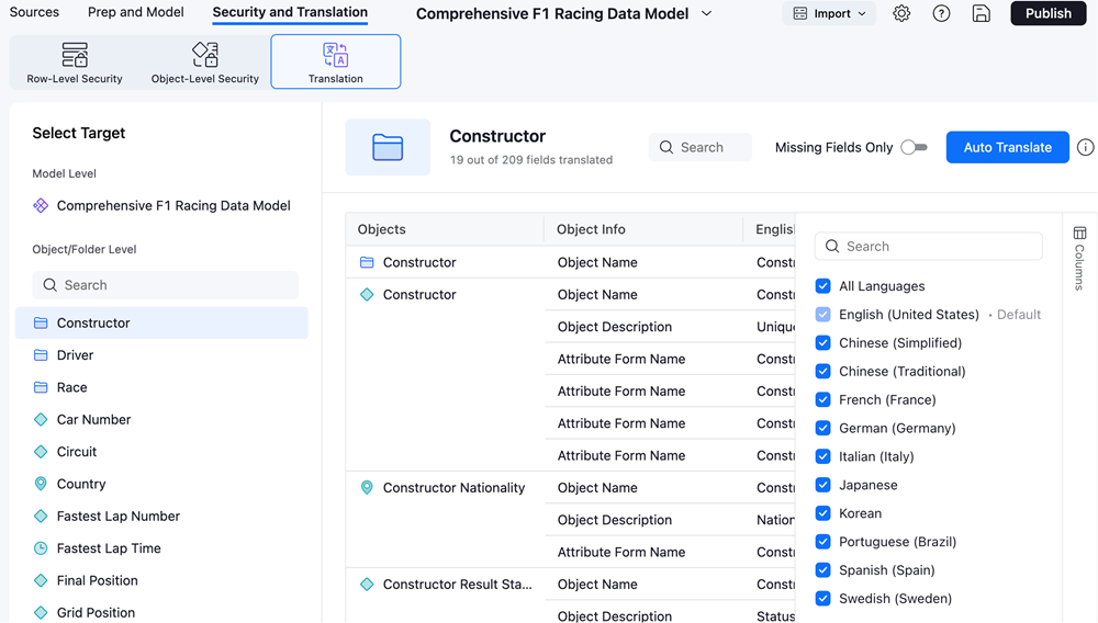 Strategy One(2025年9月)以降、翻訳エディターを使用して Mosaicモデルオブジェクトを好みの言語に翻訳できます。