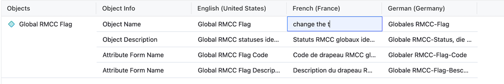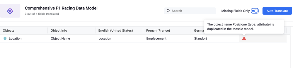 翻訳の実行後、翻訳結果が既存のエントリと重複している場合、一部のオブジェクトに警告アイコンが表示される場合があります。