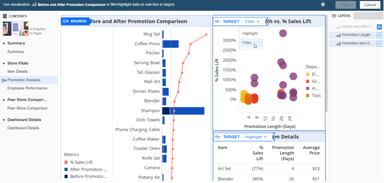 Once you add visualizations to a dashboard, you can use one visualization to filter or highlight data in another visualization. Define one visualization as the source. Then, select the other visualizations you want to filter or highlight as targets. The target visualizations only display or highlight data that also appears in the source. Your target visualization can be in any chapter or page within your dashboard.