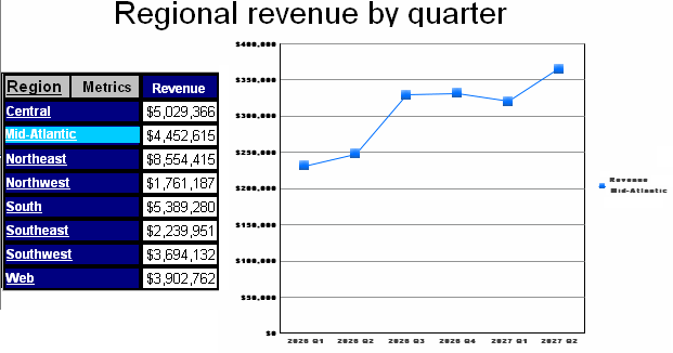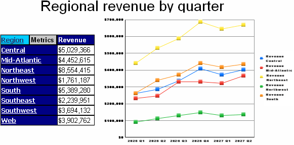 For example, two reports are displayed in a document. The grid on the left shows revenue by region. The graph on the right shows revenue by quarter and region. Notice that the two reports share a particular attribute (Region) and that the regions in the grid are underlined, which can indicate that they are used as a selector.