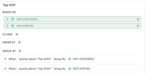 Beginning in Strategy One (January 2026), you can specify that a specific column displays but group by a different column. In the example below, if a query contains the text "Top HCPs", the response is grouped by description and then ID.