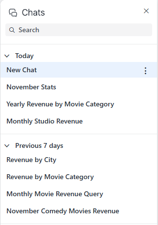 Strategy One (2025 年 5 月) 以降、チャット履歴は エージェント インターフェイスの左側に構造化された Chats パネルに表示され、ユーザーは会話をより適切に管理およびナビゲートできるようになります。