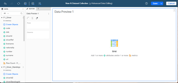 AI データセットコレクションを絞り込んで、複数のデータソースを統合します。派生メトリックを作成し、 Strategy One (2025年5月)以降では派生属性も作成できます。シームレスなデータブレンディングのために属性をリンクし、データセットに対してさまざまな操作を実行します。データの正確性を確保するために、データラングリング操作後にグリッドビジュアリゼーションを作成して値を検証し、変更されたデータセットの正確性を確認します。