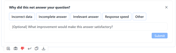 エージェントを微調整するのに役立つ一般的なフィードバックを素早く提供するには、 エージェントがあなたの質問に答えなかった理由(関連性のないデータや間違ったデータなど)をクリックします。