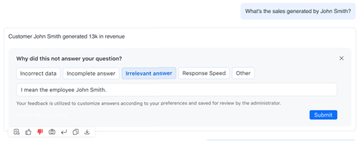 例えば、「John Smithが生成した売上は何ですか」と質問しました。 エージェントは顧客John Smithの収益で応答しました。以下の例に示すように、あなたのフィードバックは「従業員のJohn Smithのことです」です。