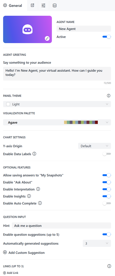 - Enable Question Suggestionsのトグルをクリックして、質問の提案を有効または無効にできます。質問の提案を有効にする場合は、動作をカスタマイズします。