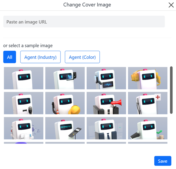 に表示されるカバー画像を変更します。サンプル画像の1つを選択するか、独自の画像のURLを貼り付けることができます。Saveをクリックします。
