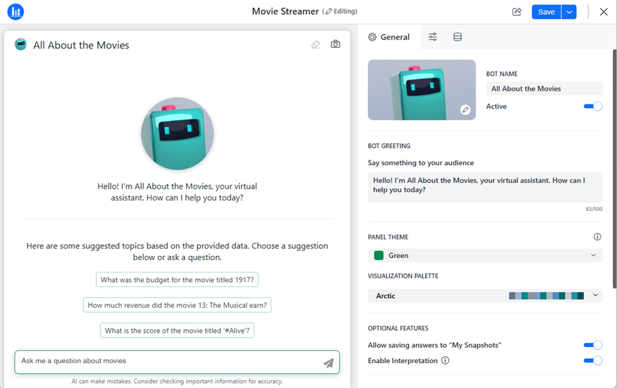 オートコンプリートを有効にして、ユーザーが入力すると一致する列名のリストを表示できます。オートコンプリートを使用すると、必要な正確なオブジェクトが選択されるため、精度が向上します。特に複数のオブジェクトが類似した名前を共有している場合、曖昧さと間違った応答を避けるのに役立ちます。