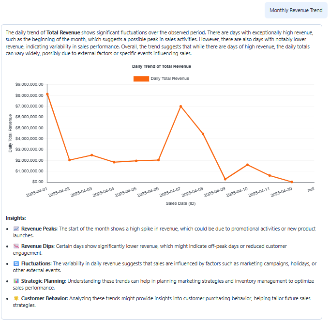Monthly Revenue Trend プロンプトの結果を以下に示します。これには、要約、ビジュアリゼーション、インサイトのリストが含まれます。