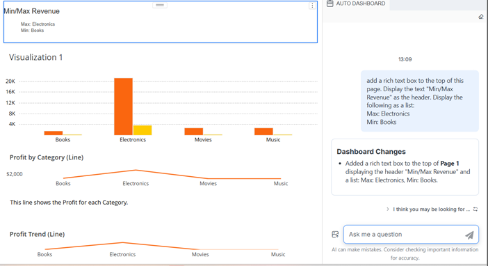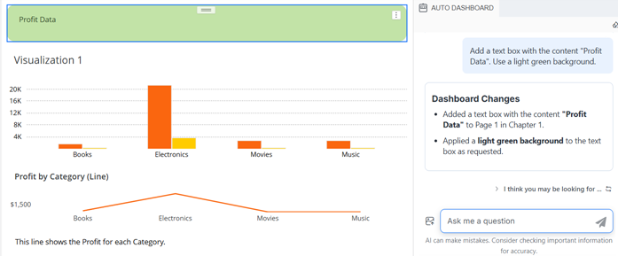 6. テキストボックスを作成するには、Auto Dashboardパネルで、テキストボックスを説明する自然言語の指示を入力します。次のことができます。