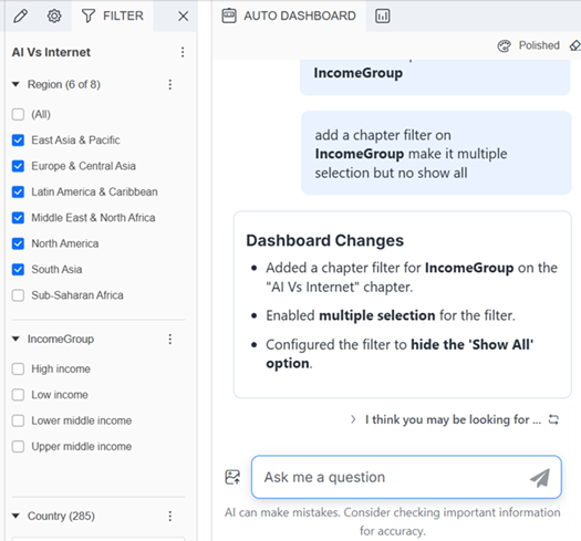 3. Strategy One (November 2025) 以降、チャプターフィルタを追加、削除、設定することにより、チャプターレベルでデータをフィルタリングできます。たとえば、質問ボックスにIncomeGroup のチャプターフィルタを追加と入力できます。新しいフィルタが追加され、すべて表示オプションで単一選択が可能になります。複数選択を許可するがすべてオプションを表示しないなど、必要なチャプターフィルタを作成するために、より多くの詳細を含めることができます。
