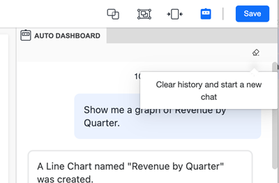 6. 前回の応答をコンテキストとして使用せずに新しいチャットを開始するには、会話履歴をクリアします。履歴をクリアすることで、以前の入力を削除し、過去のセッションからの偏見なしに分析を開始できます。特にデータが多いdashboardでは、セッション履歴により読み込み時間が増加したり、Autoが遅くなったりすることがあります。Auto Dashboardパネルで、Clear Historyをクリックし、Yesをクリックします。