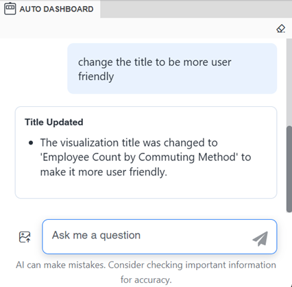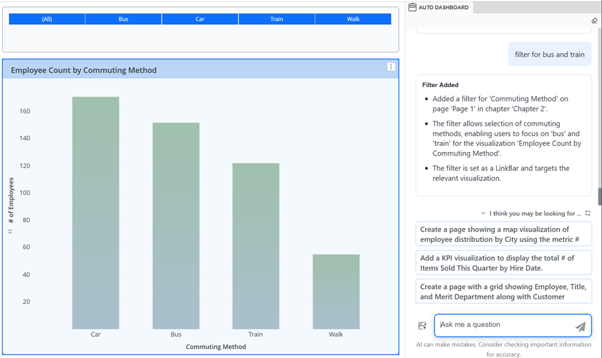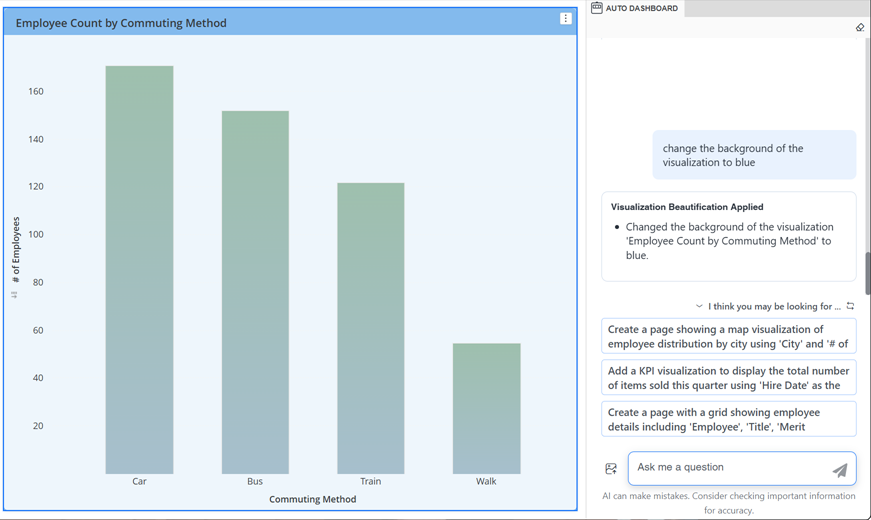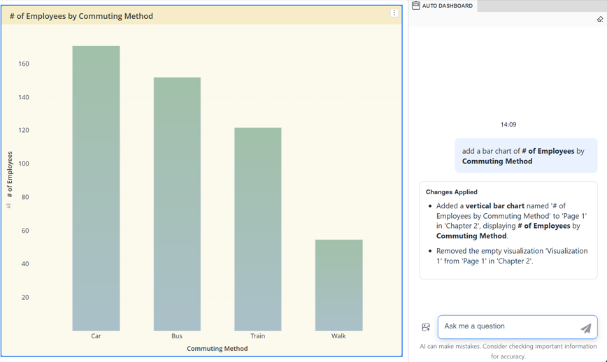 以下の例は、「add a bar chart of # of Employees by Commuting Method」への応答です。太字のテキストは、提案リストから選択されたデータセット オブジェクトです。