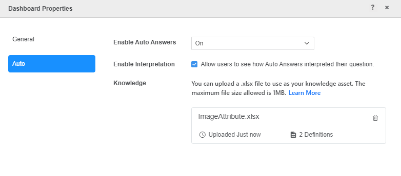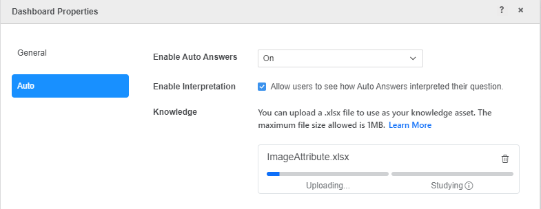 - 待機アップロード中完了します閉じる場合ダッシュボード プロパティアップロードが完了する前に警告が表示されます選択アップロードを続行ナレッジ アセットのアップロードを継続するか、強制的に閉じるアップロードをキャンセルし、Excel ファイルを削除して、閉じるダッシュボード プロパティ。
