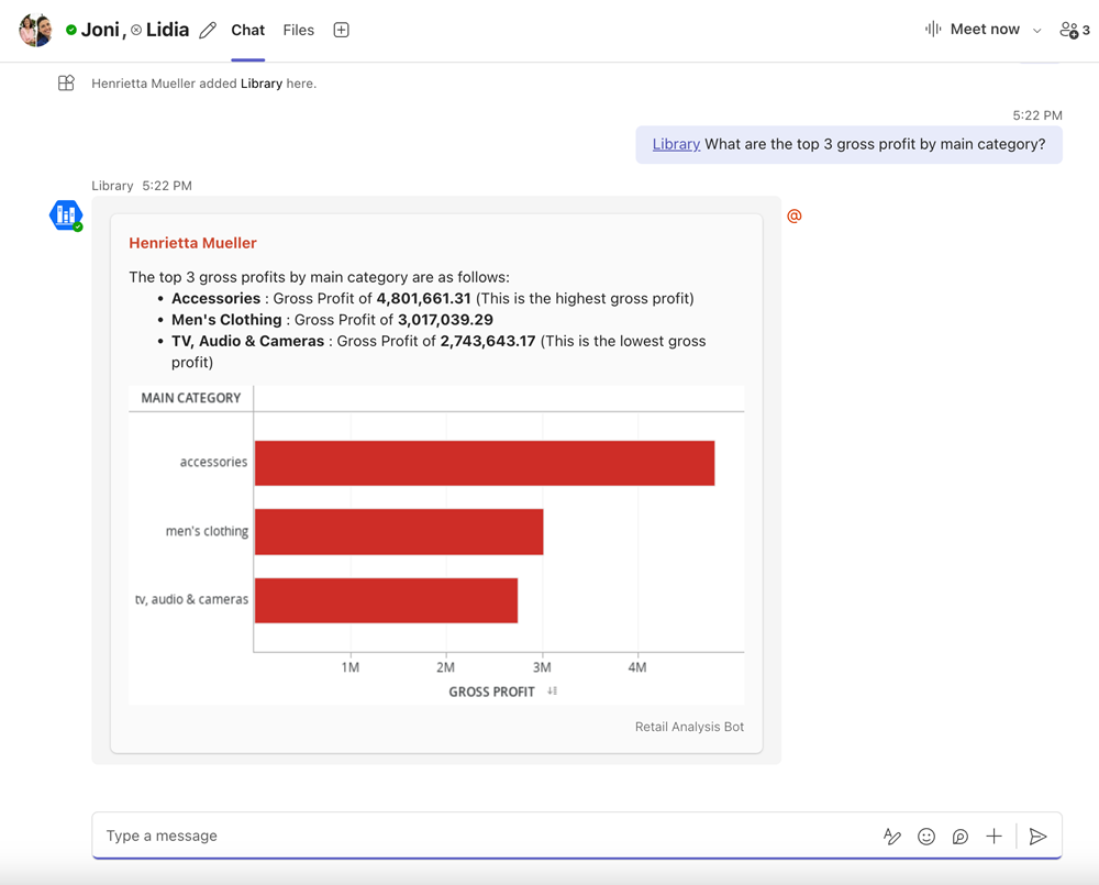 • Añadir la aplicación Teams Library a un chat en grupo y hacer preguntas relacionadas con los datos etiquetando Library