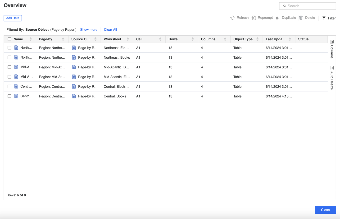 Le Présentation La boîte de dialogue affiche tous les objets de saut de page importés dans Excel pour votre rapport.