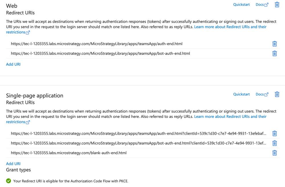 Pour la configuration Teams, si vous utilisez MicroStrategy ONE (Septembre 2024) ou ultérieure, vous devez créer deux Web plateformes et trois Application sur une seule page plateformes. Si vous utilisez une version antérieure à MicroStrategy ONE (Septembre 2024), vous devez en créer un Web plateforme et deux Application sur une seule page plateformes.